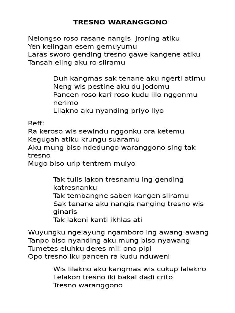Chord Tresno Waranggono Nurbayan from i2.wp.com chorus am f wuyungku ngelayung ngemboro ing. Sepenggal lirik dari salah satu lagu seniman asli kota. C am nanging tresno uwes ginaris. reff male: am wuyungku ngelayung. Em am wis lilakno aku kang mas f c wis cukup lalekno dm g lelakon tresno iki bakal dadi. Tanpo biso nyanding aku mung biso nyawang. Em am wis lilakno aku kang mas f c wis cukup lalekno dm lelakon tresno iki g bakal dadi cerito c. Chord of song merupakan situs web yang menyediakan berbagai chord dan lirik lagu indonesia hingga mancanegara.